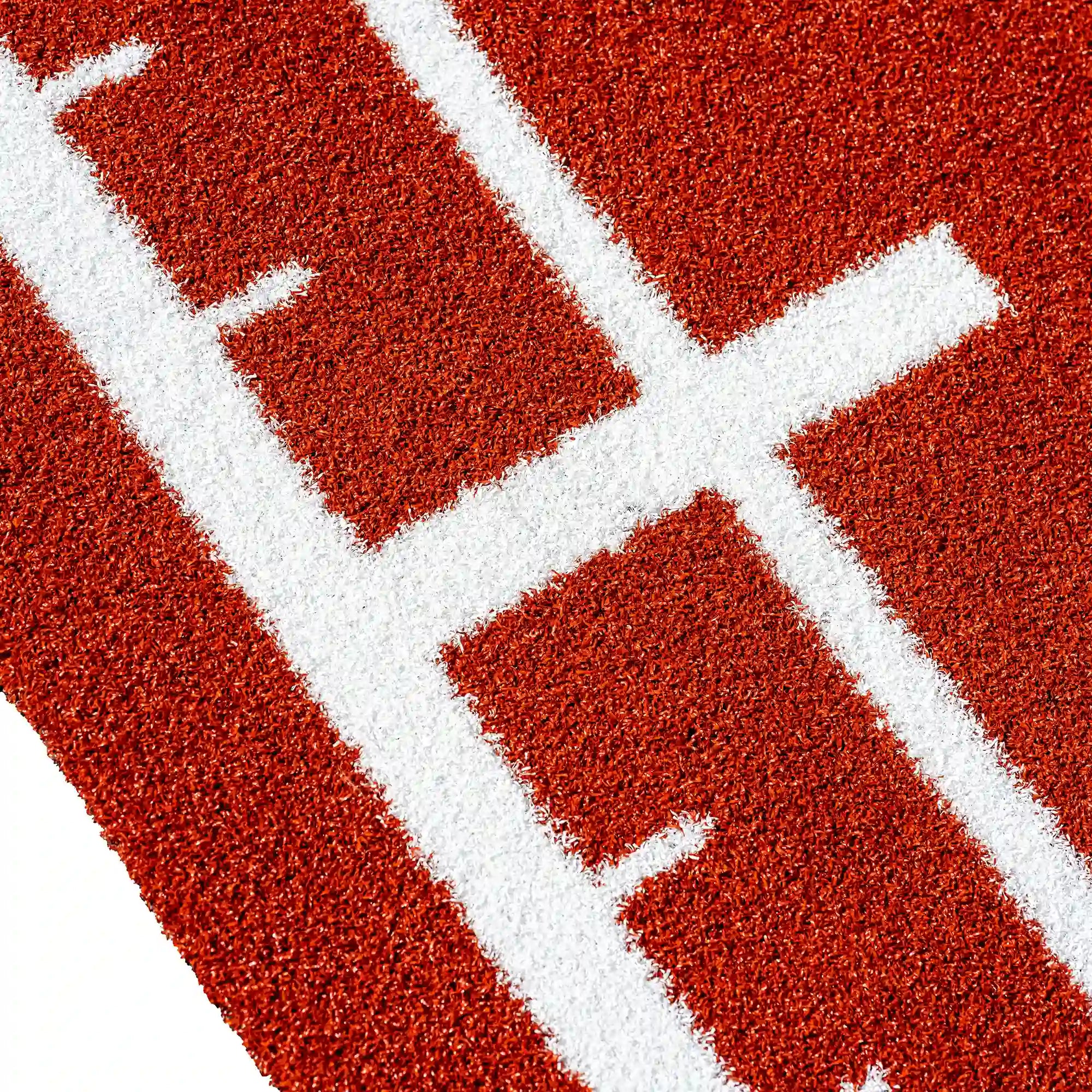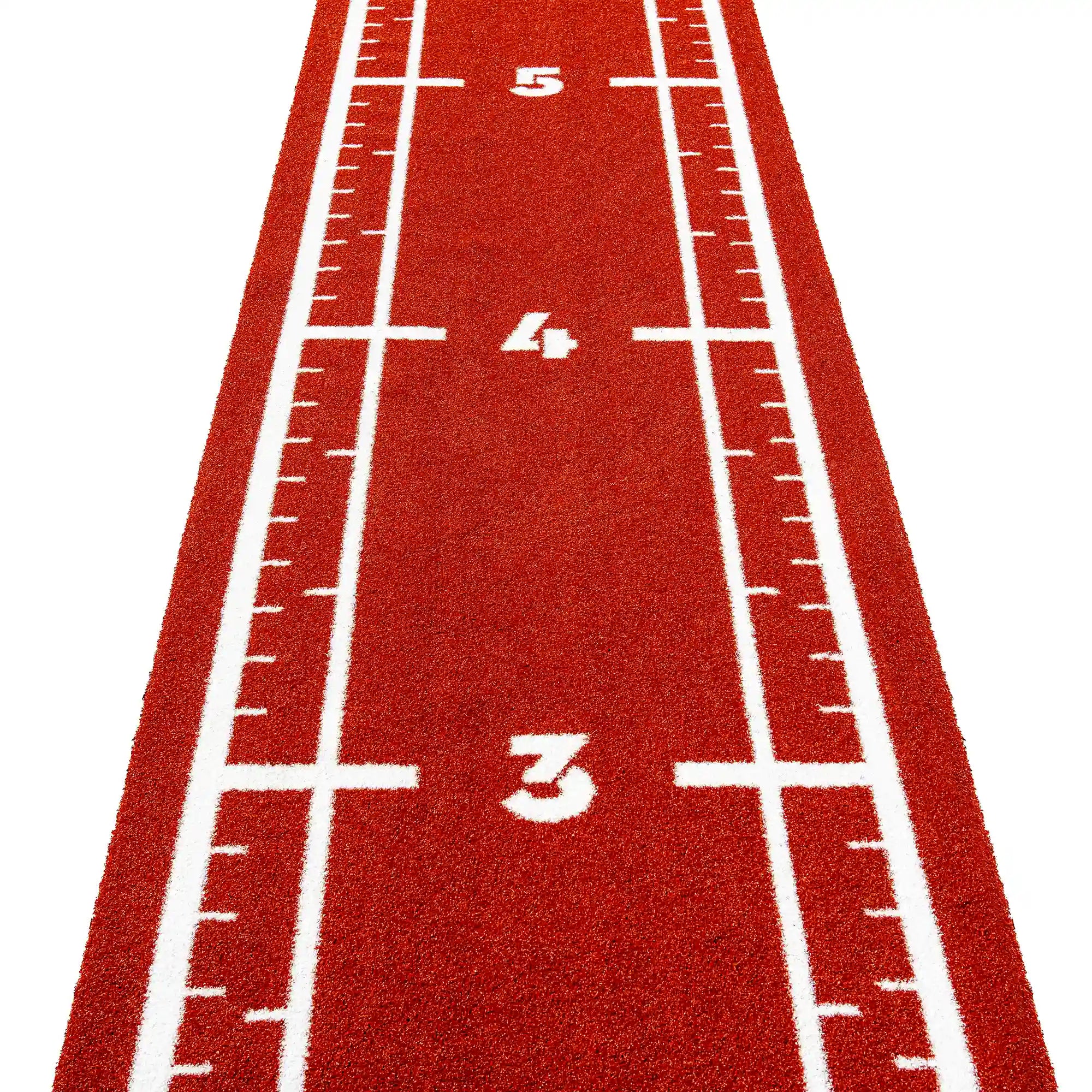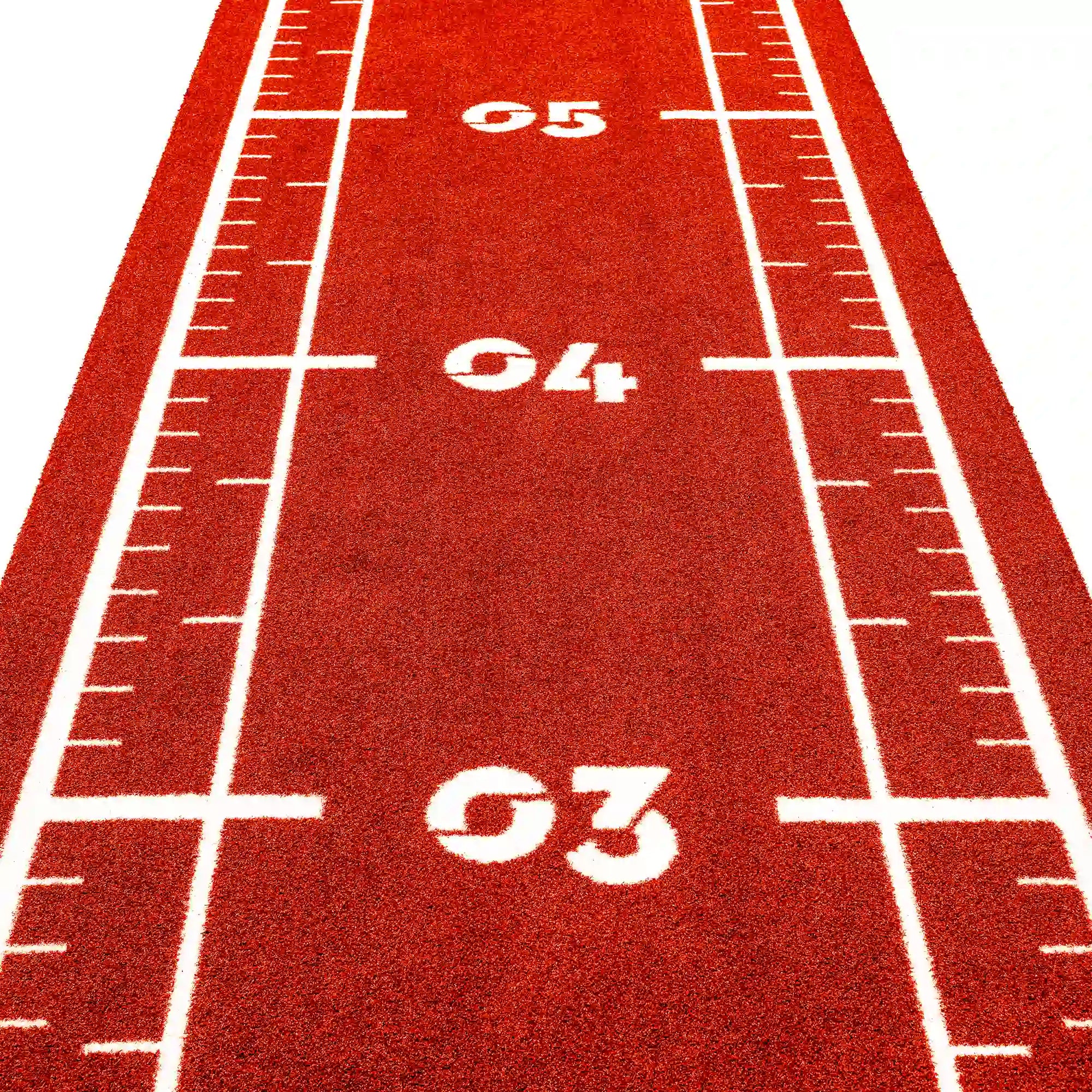 High-performance artificial turf track in bold reddish tones, with integrated white lines and numbers for precise and intense functional training.
