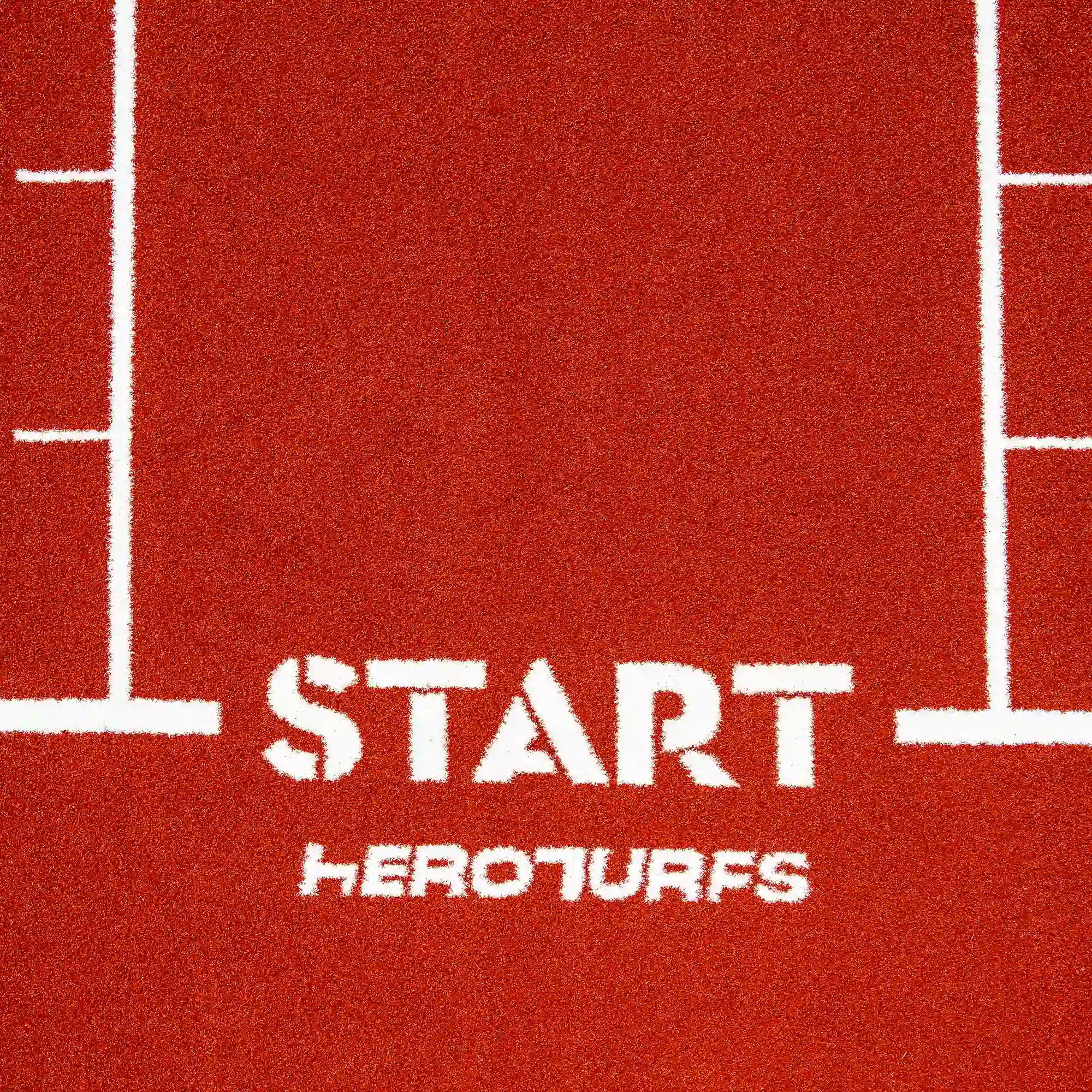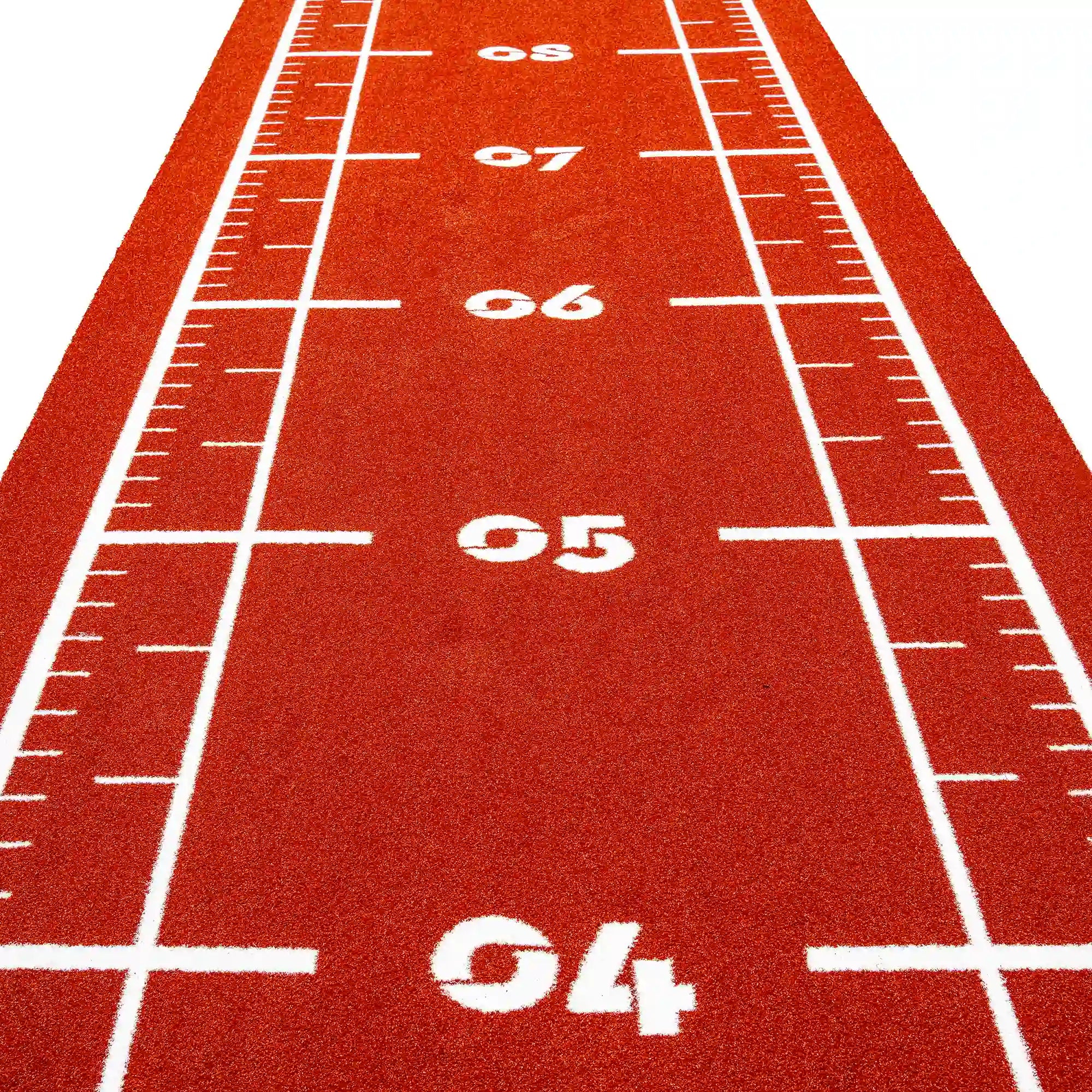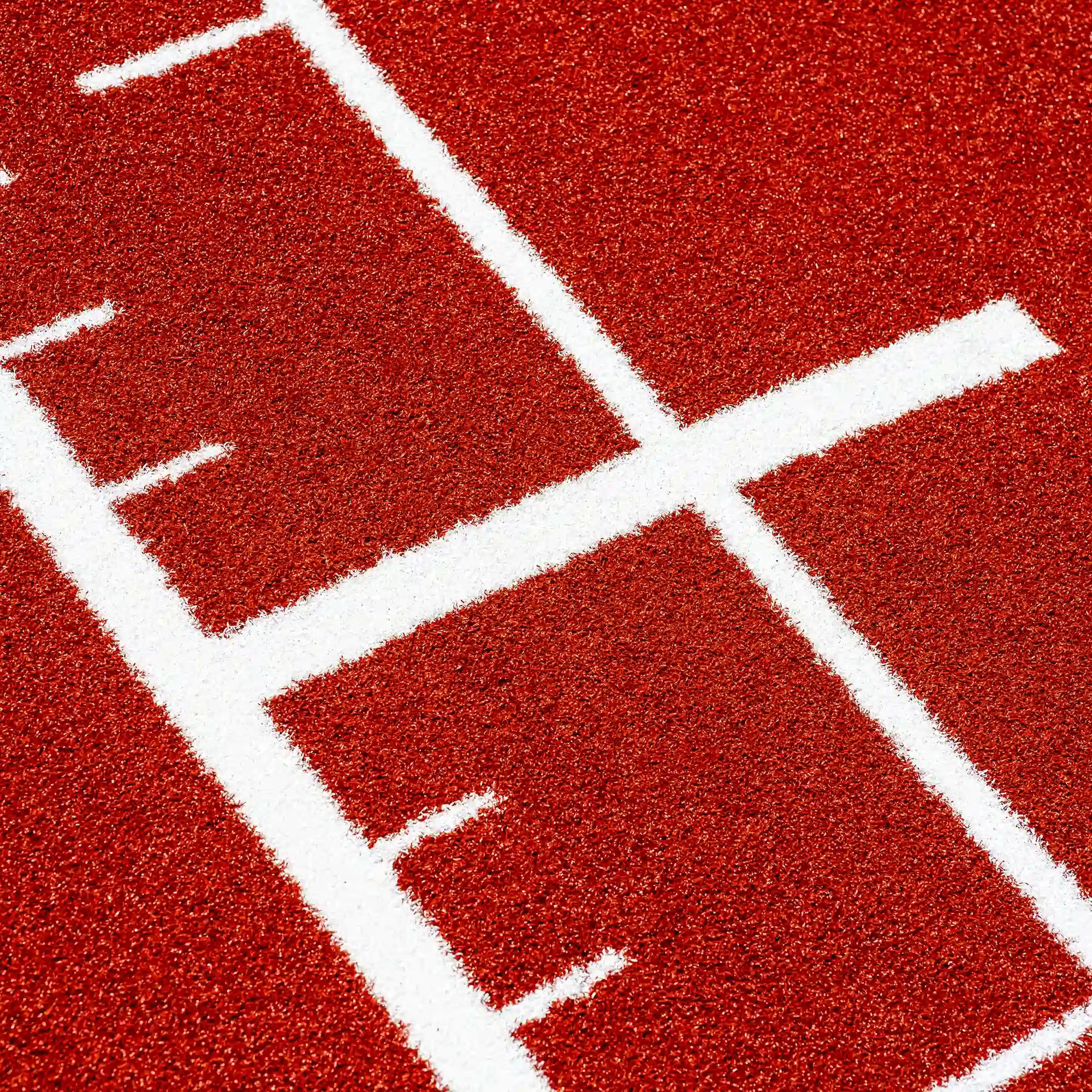 High-performance artificial turf track in bold reddish tones, with integrated white lines and numbers for precise and intense functional training.